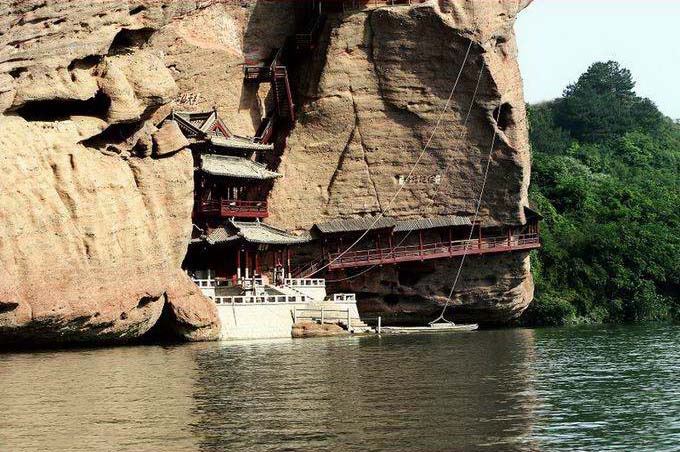 水巖在旱仙巖北面,靠上清河兩岸,因臨水而名,以碧水丹山而聞名遐邇,主體在西岸。要主景點有古棧道遺址、飛云閣、棋盤石、“仙女獻(xiàn)花”、仙梳石、金鐘峰、仙勺石、雌雄石等。怪石奇巖,滿山紛陳,隨處是景,目不暇接。從龍虎山莊附近乘船行不遠(yuǎn),對岸即是水巖,只見崖壁貼岸,陡立如屏,古樹橫生,藤蔓垂掛,山崖上古棧道遺址依然存在。在崖壁上有許多名人題刻,如“玉壁凌空”、“半天仙跡”、“神仙可接”等。至一峽口上岸,左側(cè)即絕壁獨立的“仙女獻(xiàn)花”。沿山徑上山,一路美景不斷。對岸亦是高峰聳立河邊,上清河蜿蜒中間,青山碧水,幽景迷人。