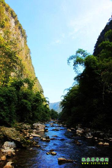 皮渡河沿岸修竹蒼翠,形成翠綠色的長(zhǎng)廊,河水清澈透亮,象一條綠色鍛子串起無(wú)數(shù)明珠。峽谷中水與山親吻,形成靈動(dòng)的水韻與雄渾的山巒,構(gòu)成一幅山水長(zhǎng)卷