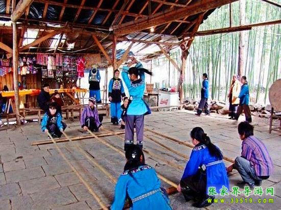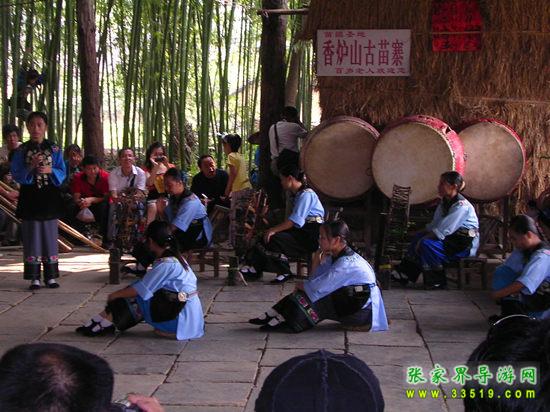 進(jìn)入鳳凰香爐山苗寨必須過(guò)三道關(guān):一是去剿匪,二是對(duì)山歌,三是喝三碗米酒。如果過(guò)不了這三道關(guān),是不能進(jìn)寨子的。剿匪就是過(guò)一道山洞(當(dāng)年土匪躲藏的地方),也就是拍攝電影《湘西剿匪記》的現(xiàn)場(chǎng),洞內(nèi)驚險(xiǎn)崎嶇,道路難走,還要過(guò)一條河,河面上的橋是用小木板釘成,僅一米寬,上面滴水,橋上很滑,橋下流水很急。