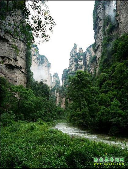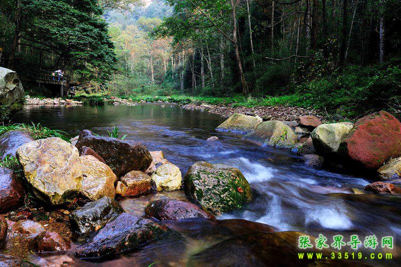 金鞭溪穿行于深壑幽谷之間,溪的兩邊千峰聳立,高入云天,樹木繁茂,濃蔭蔽日,這兒溪水潺潺、琉璃飛瀑,奇花異草與珍禽異獸同生共榮,構(gòu)成極為秀麗、清幽、自然的生態(tài)環(huán)境,被稱為“世界最美的峽谷”,“最富有詩意的溪流”。