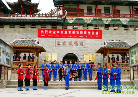土家風(fēng)情園座落在張家界市內(nèi),占地5公頃多,是一座人文景 觀與自然景觀相融合,集旅游觀光、文藝表演、奇珍展覽、住宿、娛樂、購(gòu)物等于一體的大型綜合性旅游服務(wù)企業(yè)。其主要由土家建筑群落、民風(fēng)民俗展示、文藝表演、客房、餐飲、大型狩獵場(chǎng)、珍稀植物園、根雕基地等功能區(qū)構(gòu)成。園內(nèi)建筑多為木石結(jié)構(gòu),雕梁畫棟,金碧徽煌、飛檐翹角 、玲瓏雅致。2001年4月,國(guó)務(wù)院總理朱镕基入園視察并給予很高的評(píng)價(jià)。2002年9月,由一千人參加表演的千人毛古斯舞蹈活動(dòng)在園內(nèi)舉辦并獲得圓滿成功,千人毛古斯和九重天吊腳樓同時(shí)被列入世界吉利斯記錄。2004年1月,土家風(fēng)情園被評(píng)為國(guó)家4A級(jí)旅游區(qū)(點(diǎn))。
