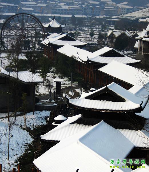 依山傍水而建的土家庭院,總面積有10826.7平方米,形成土家建筑群,分布了商鋪、茶樓、飯店、辦公區(qū)域。哈利路亞音樂廳是廣場中最大的建筑,它采用了全國獨一無二的斜屋坡面綠化,具有演藝和展示雙重功能,外墻裝飾有流線性的藝術美感,屋頂綠化與大自然相融,點綴著多色草木,色彩繽紛,形成了“空中花園”的自然觀感。