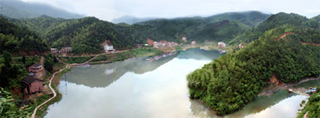 乘船溯源而上,一座垂釣休閑、功能齊全的“村莊”豁然呈現(xiàn)在我們眼前,那就是在開發(fā)建設中的白泥度假村。四面青山環(huán)繞,一座座裝飾雅致的小木屋鑲嵌其中。木屋旁邊清波鱗鱗,魚群嬉戲水中,依稀可見。