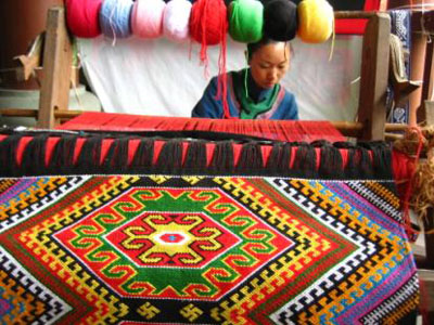 土家織錦是土家婦女用一種古老的木腰機,以棉紗為經(jīng),對五彩絲線或棉線(當今也有用毛線的) 為緯,完全用手工織成的手工藝術品。