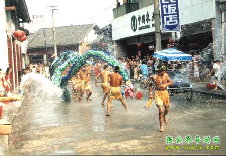 張家界潑水龍又叫“澆水龍”,于唐朝時期由移居本地的白族興起演變而成,在永定區(qū)的尹家溪鎮(zhèn)西尹村、莫家崗村十分盛行,是當(dāng)?shù)?a class="insidelink" href="http://www.xc6688s.com/fengqing/" title="土家族">土家族,白族、苗族在天熱干旱時節(jié)求雨祈福的一種形式。一旦出現(xiàn)旱災(zāi),當(dāng)?shù)仡^面人物就會出來組織潑水龍,演出極其隆重。