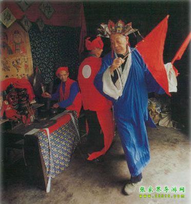 儺戲在湘西土家族地區(qū)也稱儺堂戲、儺神戲,它與土家族原始巫教、巫術(shù)的關(guān)系極為密切。土家族先民信奉的神有儺神、八部大神、土地神等,作為一種宗教活動,這種原始信仰與社會生產(chǎn)活動、文娛活動及民族習俗是融為一體的,因此儺戲最先的“沖儺還原”帶有明顯迷信色彩,土家族群眾中有“一儺沖百鬼,一愿了千神”的說法,湘西土家族人干脆叫它為“神戲”。湘西土家族儺戲的發(fā)展過程大體是儺、儺舞、儺儀然后才產(chǎn)生儺戲。儺舞源于久遠的蒙昧時期,土家先民們在同大自然作斗爭、同毒蟲猛獸作斗爭,便產(chǎn)生了化裝護面、在鼓樂聲中奔騰呼號、沖殺跳躍的原始儺舞,其所模擬的鳥雀舞、猿猴舞、熊舞等頗為壯觀。儺舞與儺這種驅(qū)鬼消災的祭祀儀式結(jié)合后,增加了祈求人獸平安、五谷豐登、緬懷祖先、勸人去惡從善、以及傳播生產(chǎn)知識等內(nèi)容,這就逐漸形成了兼?zhèn)潢U弘教義及娛樂性質(zhì)的祭祀風俗歌舞。[2]土家族儺戲就是在此基礎(chǔ)上發(fā)展起來的。部分土家族學者認為土家族儺戲的遠源可以追溯到戰(zhàn)國時代的《九歌》,《九歌》是土家族儺戲的雛形,他們的依據(jù)是當時楚國的沅湘流域,人們“信巫鬼、重淫祀”(《漢書·地理志》),從而使得“陰陽人鬼之間,又或不能無褻慢淫荒之雜”(宋代朱熹《楚辭集注》)。屈原正是加工整理了這一類“鄙陋”之詞,才創(chuàng)作出《九歌》、《天問》等名篇。也有部分學者不贊同這種論點,他們認為土家族儺在宋代還停留在儺祭和儺舞階段,最遲到明代,土家族儺才發(fā)展成為儺戲[3]。嘉靖《常德府志》記載:“歲除,歲將盡數(shù)日,鄉(xiāng)村多用巫師,朱裳鬼面,鑼鼓喧舞竟夜,名曰還儺。”文中未點明“儺戲”二字,但卻使用了“還儺”一詞,這與今天民間對儺戲的稱呼相似。又據(jù)清乾隆《永順縣志》載:“永俗酬神,必延辰郡巫師唱演儺戲,……至晚,演儺戲。敲鑼擊鼓,人各紙面一,有女裝者,曰孟姜女;男扮者,曰范七郎。”在土家族儺戲中,孟姜女傳說故事占著非常重要的地位。在湘西土家族地區(qū),儺戲一般有二十四正戲,即二十四戲神。每次儺儀結(jié)束時,巫師要用香火在黃裱紙上燒二十四個洞,以表示奠祭二十四戲神。民間有諺語:“儺神菩薩不識字,只要二十四個圈圈滿。”在二十四儺神中,被稱為勾愿神的姜女、范郎是還儺愿時非常重要的兩位神靈。在儺戲中,《孟姜女》是整場的高潮,平時,儺戲唱完后,由沒下裝的孟姜女、范郎去向主人家及觀眾“拜臺”,以示“了愿”。清代中期以后,儺戲吸取了花燈、陽戲、高腔等其他地方戲劇劇種的唱腔和劇目,逐漸變得日益成熟。我們仔細查看了全國371個劇種,發(fā)現(xiàn)儺戲、花燈戲有著相同的班社,也就是說一個演出班社可以演出儺戲、花燈戲兩個劇種。這段時期,儺戲已作為獨立戲劇劇種參加演出。由于儺戲是由巫儺法事演變而成的戲劇形式,經(jīng)歷著巫儺法事(驅(qū)鬼祭祀)、儺壇上戲和儺堂正戲的發(fā)展過程。
