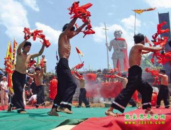 搖鈴隊伍圍圓圈有節(jié)拍的搖鈴。圓圈中另兩人面對面用肩共杠一根齊眉棍(木桿),左手叉腰,右手扶棍。從棍上搭一疋絲帕,一氣功師進(jìn)來拿絲帕一頭,另一壯漢拿線帕另一頭。氣功師手拿絲帕慢慢下蹲,壯漢牢牢握緊絲帕。待氣功師翻天睡在地上后,其他人搬一床棉被蓋其肚部,再在上面放一塊木板,木板上放一副大石磨,石磨上架一套鐵犁、粑。氣功師睡在地上用右手打竹掛,口喊:"打個陰陽一只"!把竹掛打在地上,掛未成陰陽一只時,還要繼續(xù)打,直到打成,才把放在氣功師肚部的所有東西取下,氣功師雙手握緊絲帕慢慢起身站立。表演結(jié)束。