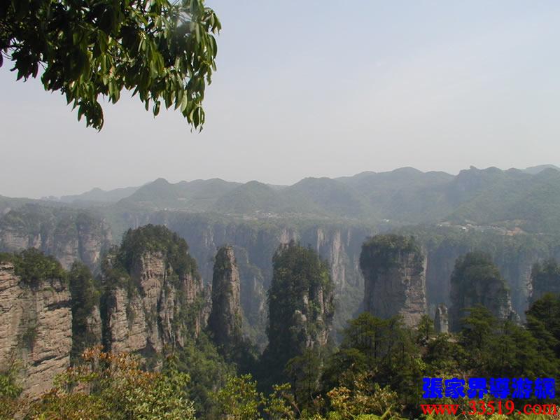 在整個武陵源風(fēng)景名勝區(qū),類似“天書寶匣”這種形態(tài)各一的景觀比比皆是。因此,您盡可以發(fā)揮各自的想像力,給它們?nèi)∫粋€有意思的名字。大家看,右前方那座高高的石峰,像不像掛著的一塊石碑?那就是龜精倉惶中丟下的天書,民間叫“天書高掛”,三個山峰之間正中的那個山峰,像不像只報曉的金雞?傳說龜精盜天書之時,正趕上金雞報曉,故名金雞報曉。
