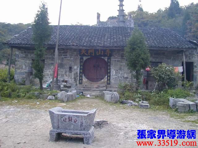 (天門(mén)山寺)天門(mén)山寺最早建于唐代,古稱(chēng)云缽庵、靈泉院、嵩梁堂,明代時(shí),因擇址不當(dāng)而屢遭風(fēng)摧又常遭水荒,才將天門(mén)山寺從東部山頂遷移至此。以前這里古木參天,濃蔭蔽日。古寺門(mén)楣上刻有“天門(mén)仙山”四字,大門(mén)兩邊的對(duì)聯(lián)是:“天外有天天不夜,山上無(wú)山山獨(dú)尊”,傳為李自成部將野拂撰書(shū)。進(jìn)門(mén)為大佛殿后面有觀音堂,兩邊六間平房,最后一棟是祖師殿,規(guī)模宏大。民間概括為“三進(jìn)堂、六耳房,磚墻鐵瓦鍋如壙”。山寺原建筑十分講究,飛檐翹角,雕龍畫(huà)鳳,并塑有佛道神像菩薩等。還有大鼓一面,千斤大鐘一口,一座七級(jí)石塔和一個(gè)大化錢(qián)爐。據(jù)碑刻記載,自清乾隆至民國(guó)五年的163年間,天門(mén)山寺共修葺過(guò)七次,香火曾盛極一時(shí),湘鄂川黔邊境十多個(gè)縣的信徒絡(luò)繹不絕,都來(lái)這里進(jìn)香拜佛。現(xiàn)天門(mén)山旅游股份有限公司正在大規(guī)模地修復(fù)天門(mén)山寺,昔日的繁華又將重現(xiàn)。