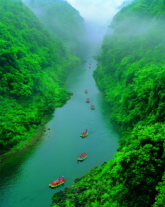 7點準(zhǔn)時等在萊頓大酒店門口,猛洞河漂流180元/人,漂流的車一般會來接參加漂流的客人的,上了車已經(jīng)有好幾位游客,然后車子又去接了幾位,7:30人接齊,離開張家界去猛洞河,車程約1個半個小時,漂流約2個半小時。在萊頓大酒店的那個晚上張家界半夜打雷下雨,我們想今天水很大,漂流會很刺激。到了那邊才知道上游建了水壩調(diào)節(jié)水量搞平均主義,所以漂流的驚險度一般般了,后來去鳳凰公路上比較顛簸,我戲稱可以將車當(dāng)船補(bǔ)足漂流的感覺,呵呵。不過瀑布因此壯觀不少,漂流沿途至少見到有七八條瀑布,非常漂亮。